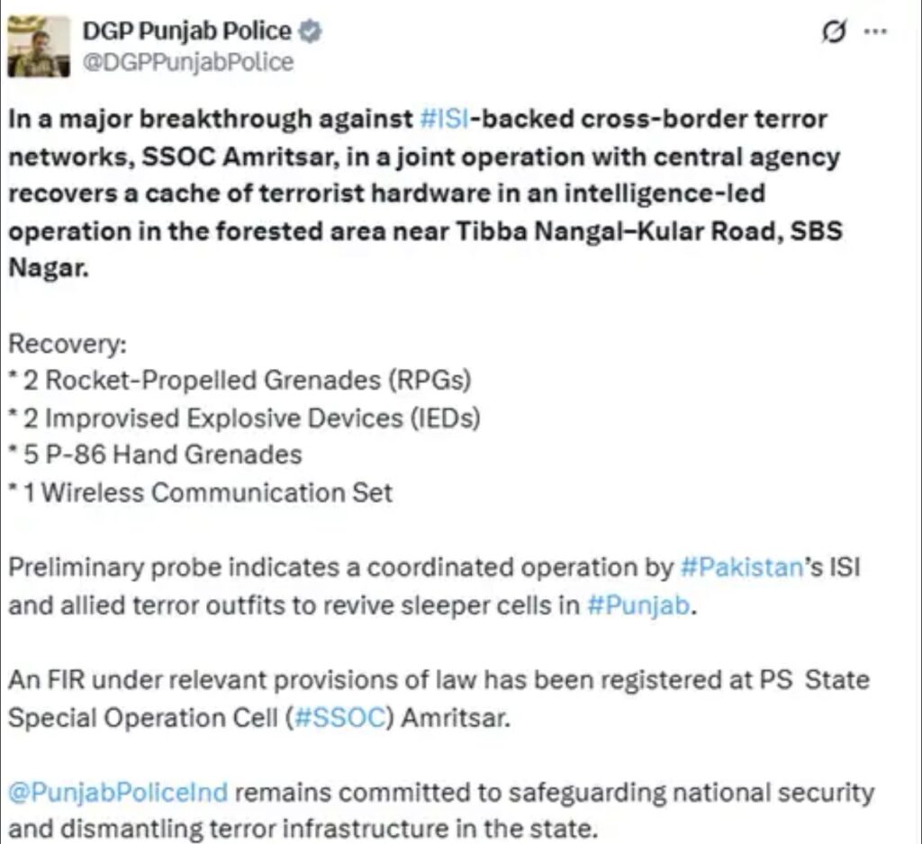 ਅੰਮ੍ਰਿਤਸਰ, 6 ਮਈ (ਰਵਿੰਦਰ ਸ਼ਰਮਾ) : ਪਹਿਲਗਾਮ ਵਿੱਚ ਹੋਏ ਅੱਤਵਾਦੀ ਹਮਲੇ ਤੋਂ ਬਾਅਦ, ਪੁਲਿਸ ਨੇ ਪੰਜਾਬ ਦੇ ਸ਼ਹੀਦ ਭਗਤ ਸਿੰਘ ਨਗਰ (ਨਵਾਂਸ਼ਹਿਰ) ਦੇ ਜੰਗਲਾਂ ਤੋਂ 2 ਆਰਪੀਜੀ, 2 ਆਈਈਡੀ, 5 ਹੈਂਡ ਗ੍ਰਨੇਡ ਅਤੇ ਇੱਕ ਵਾਇਰਲੈੱਸ ਸੰਚਾਰ ਸੈੱਟ ਬਰਾਮਦ ਕੀਤਾ। ਖੁਫੀਆ ਜਾਣਕਾਰੀ ਤੋਂ ਬਾਅਦ, ਅੰਮ੍ਰਿਤਸਰ ਦਾ ਸਟੇਟ ਸਪੈਸ਼ਲ ਆਪ੍ਰੇਸ਼ਨ ਸੈੱਲ ਕੇਂਦਰੀ ਏਜੰਸੀ ਦੇ ਨਾਲ ਟਿੱਬਾ ਨੰਗਲ-ਕੁਲਾਰ ਰੋਡ ਦੇ ਨੇੜੇ ਜੰਗਲ ਵਿੱਚ ਪਹੁੰਚਿਆ ਸੀ। ਟੀਮ ਨੂੰ ਤਲਾਸ਼ੀ ਮੁਹਿੰਮ ਦੌਰਾਨ ਵਿਸਫੋਟਕ ਸਮੱਗਰੀ ਮਿਲੀ। ਪੰਜਾਬ ਦੇ ਡੀਜੀਪੀ ਗੌਰਵ ਯਾਦਵ ਨੇ ਇਸ ਦੀ ਪੁਸ਼ਟੀ ਕੀਤੀ ਹੈ। ਉਨ੍ਹਾਂ ਸੋਸ਼ਲ ਮੀਡੀਆ ਪਲੇਟਫਾਰਮ ਐਕਸ ‘ਤੇ ਲਿਖਿਆ- ਸ਼ੁਰੂਆਤੀ ਜਾਂਚ ਤੋਂ ਸੰਕੇਤ ਮਿਲਿਆ ਹੈ ਕਿ ਪਾਕਿਸਤਾਨ ਦੀ ਆਈਐਸਆਈ ਅਤੇ ਇਸ ਨਾਲ ਜੁੜੇ ਅੱਤਵਾਦੀ ਸੰਗਠਨਾਂ ਨੇ ਪੰਜਾਬ ਵਿੱਚ ਲੁਕੇ ਆਪਣੇ ਸਲੀਪਰ ਸੈੱਲਾਂ ਨੂੰ ਮੁੜ ਸਰਗਰਮ ਕਰਨ ਦੀ ਯੋਜਨਾ ਬਣਾਈ ਸੀ।